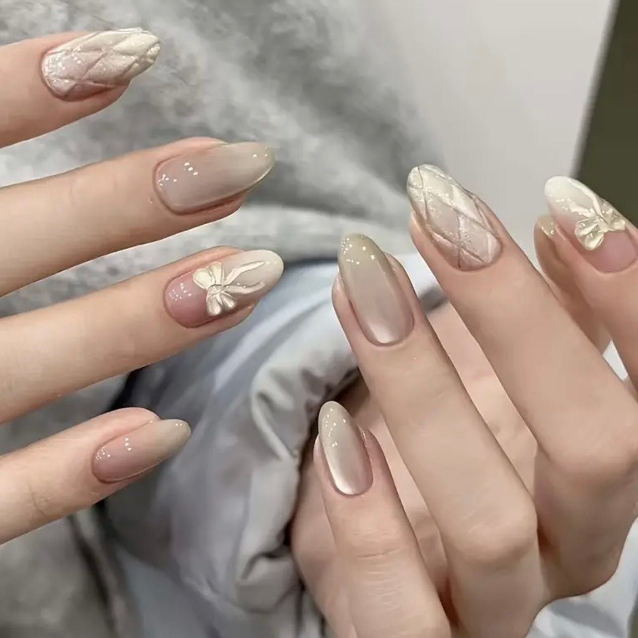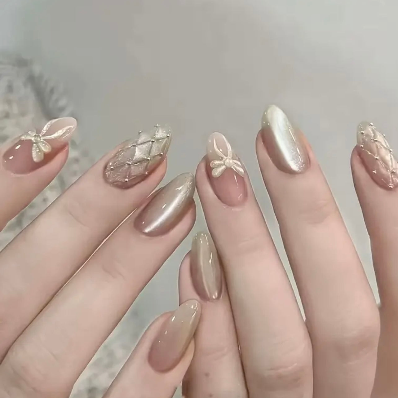 Royalty doesn’t ask — she commands. BOW TO ME is a 10-piece press-on set crafted for the elegant ruler with a taste for glamour. These medium-long almond nails glow in a powdery gold with a hypnotic cat-eye shimmer. A dainty bow crowns one nail per hand, while a chic crisscrossed design adds just the right edge. Luxe, feminine, and unapologetically in charge.