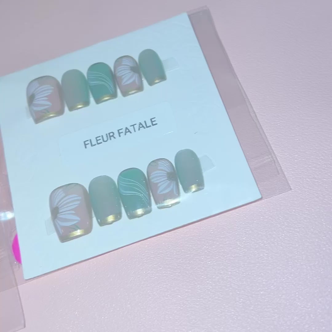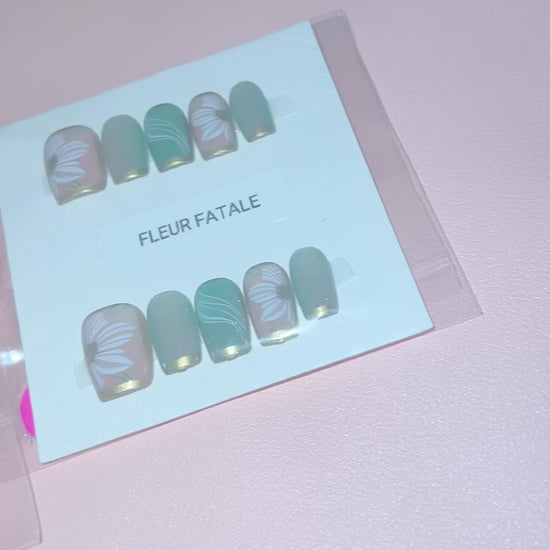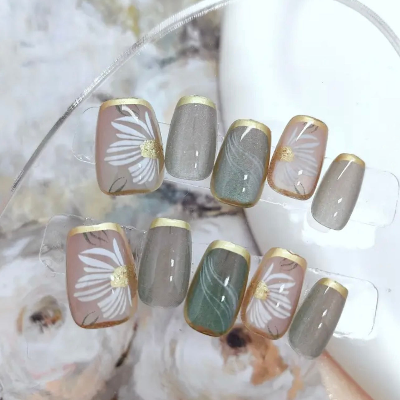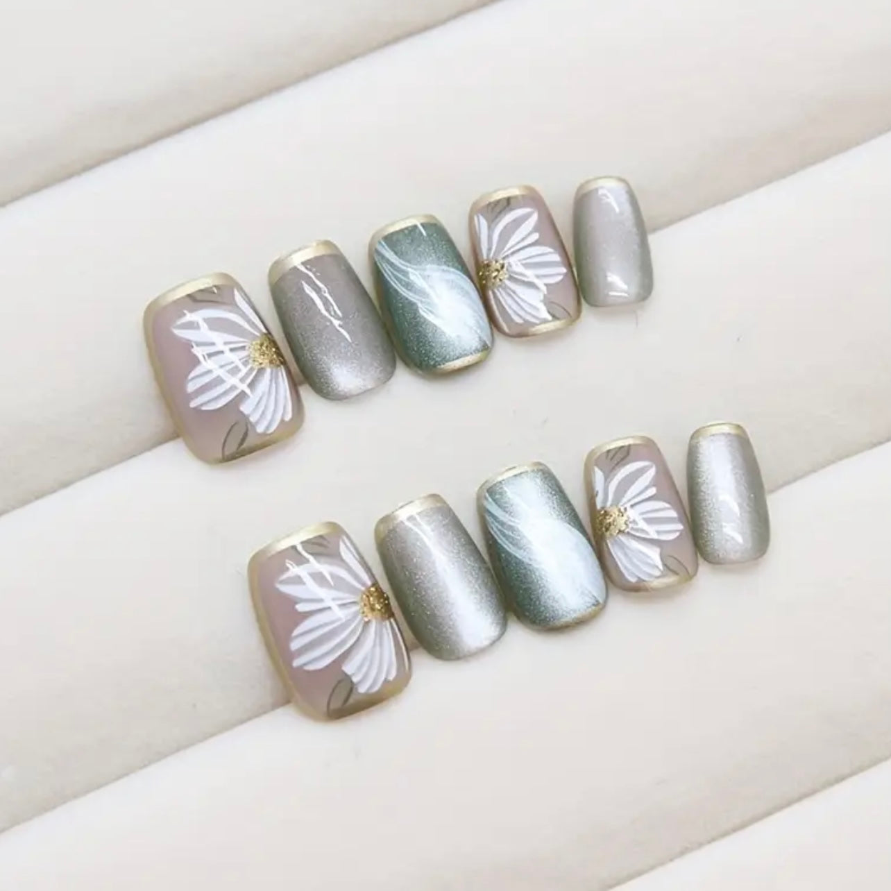 A flirtatious fusion of elegance and edge. These sexy cat-eye nails blend soft nude tones with flashes of emerald light green, creating an alluring, hypnotic effect. Delicate floral accents bloom on select nails, while refined gold French tips add a touch of glamour. Perfect for making a statement without saying a word.