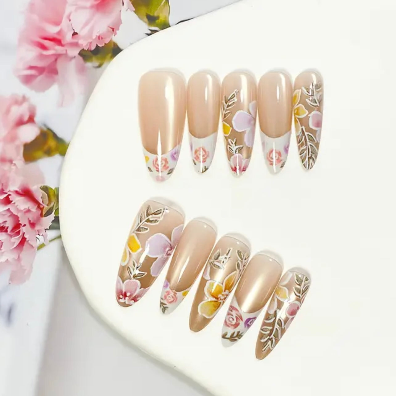Embrace timeless beauty with French Petal Bloom — a set of 10 almond-shaped press-on nails designed with classic French tips and delicate floral accents. The perfect blend of elegance and charm, these nails bring a fresh, feminine touch to any look.