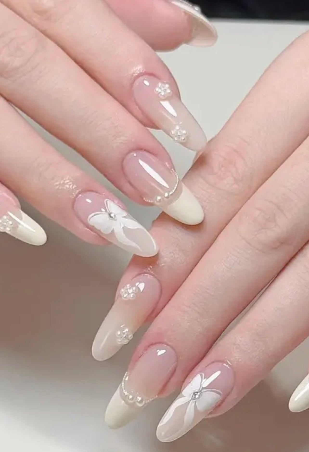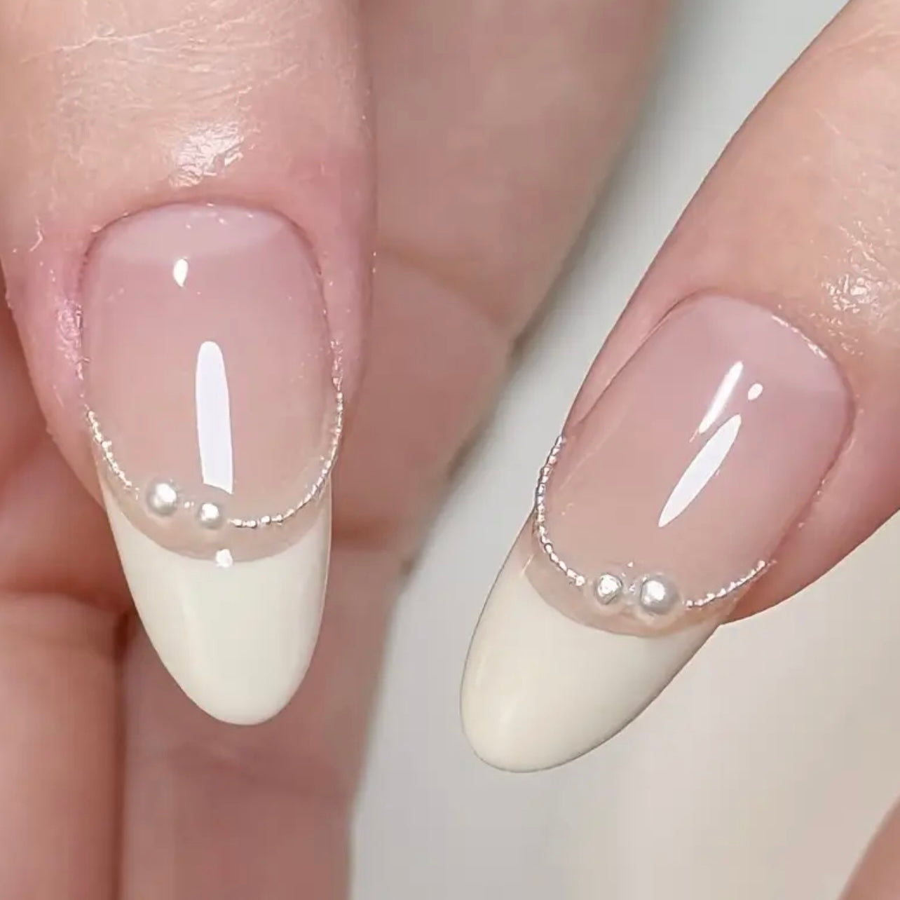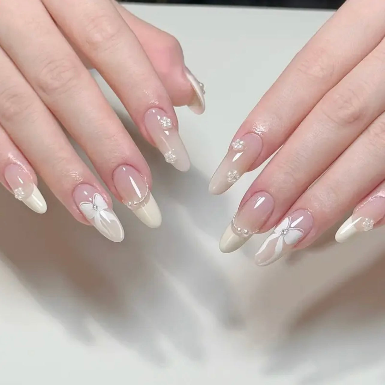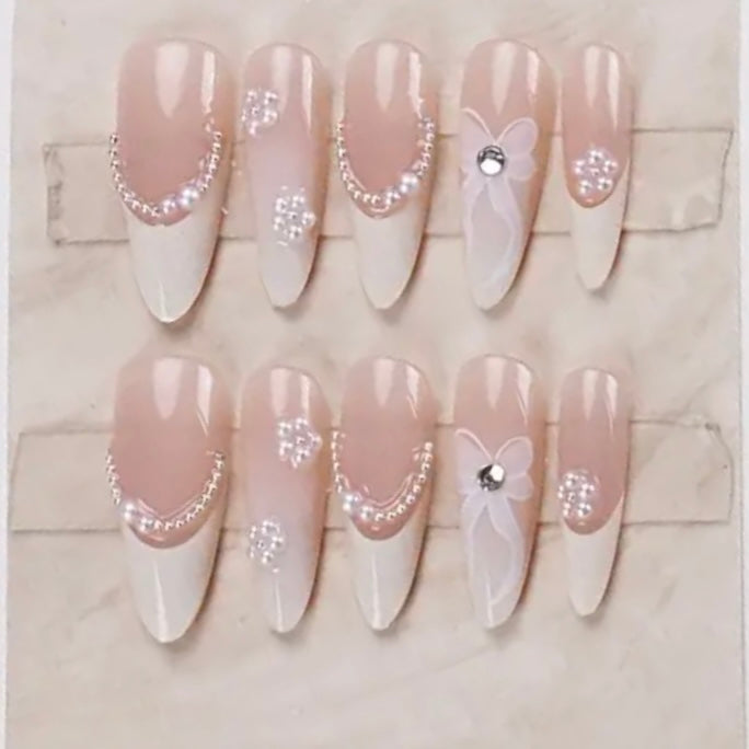 Elegant and timeless, these classic French press-on nails (10 pcs) feature a long almond shape, adorned with delicate pearls and a stunning rhinestone bow on the ring finger.