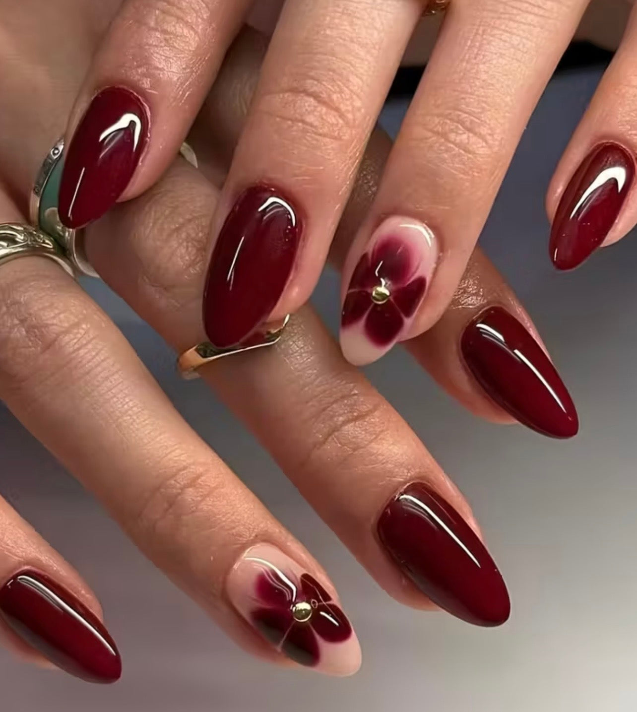 Rich, romantic, and effortlessly elegant. Petals In Wine features deep maroon glossy nails paired with soft nude accents, delicately finished with hand-painted wine-colored petals and a subtle gold center for a refined floral touch.