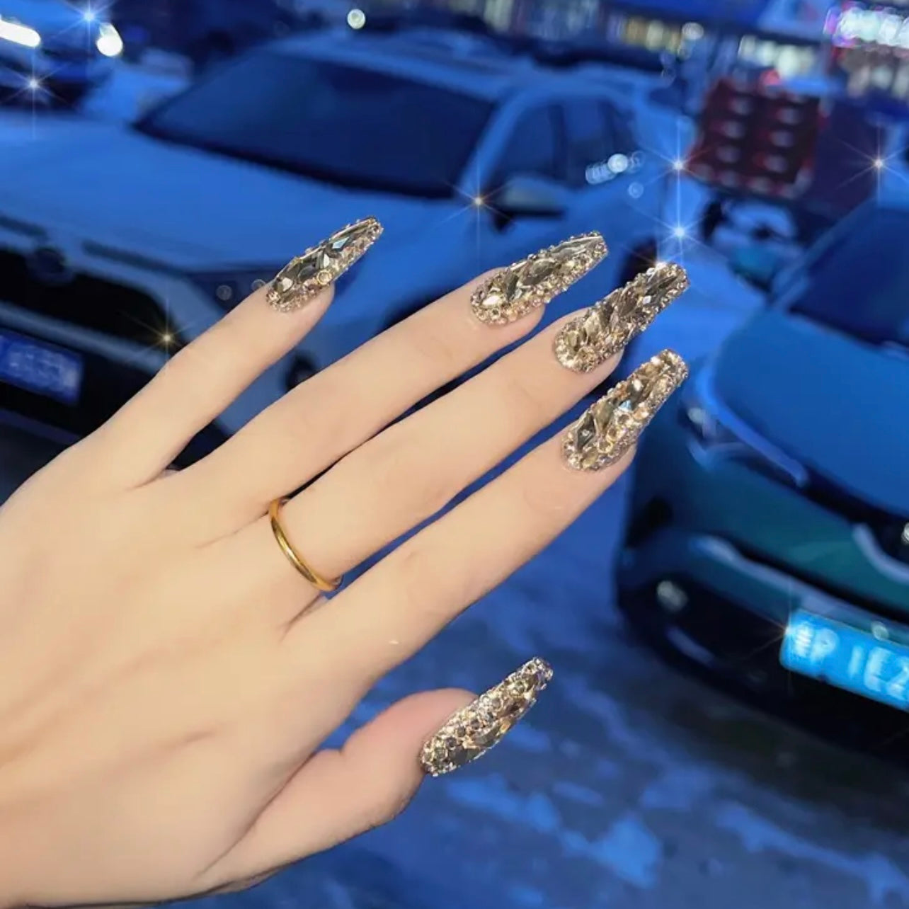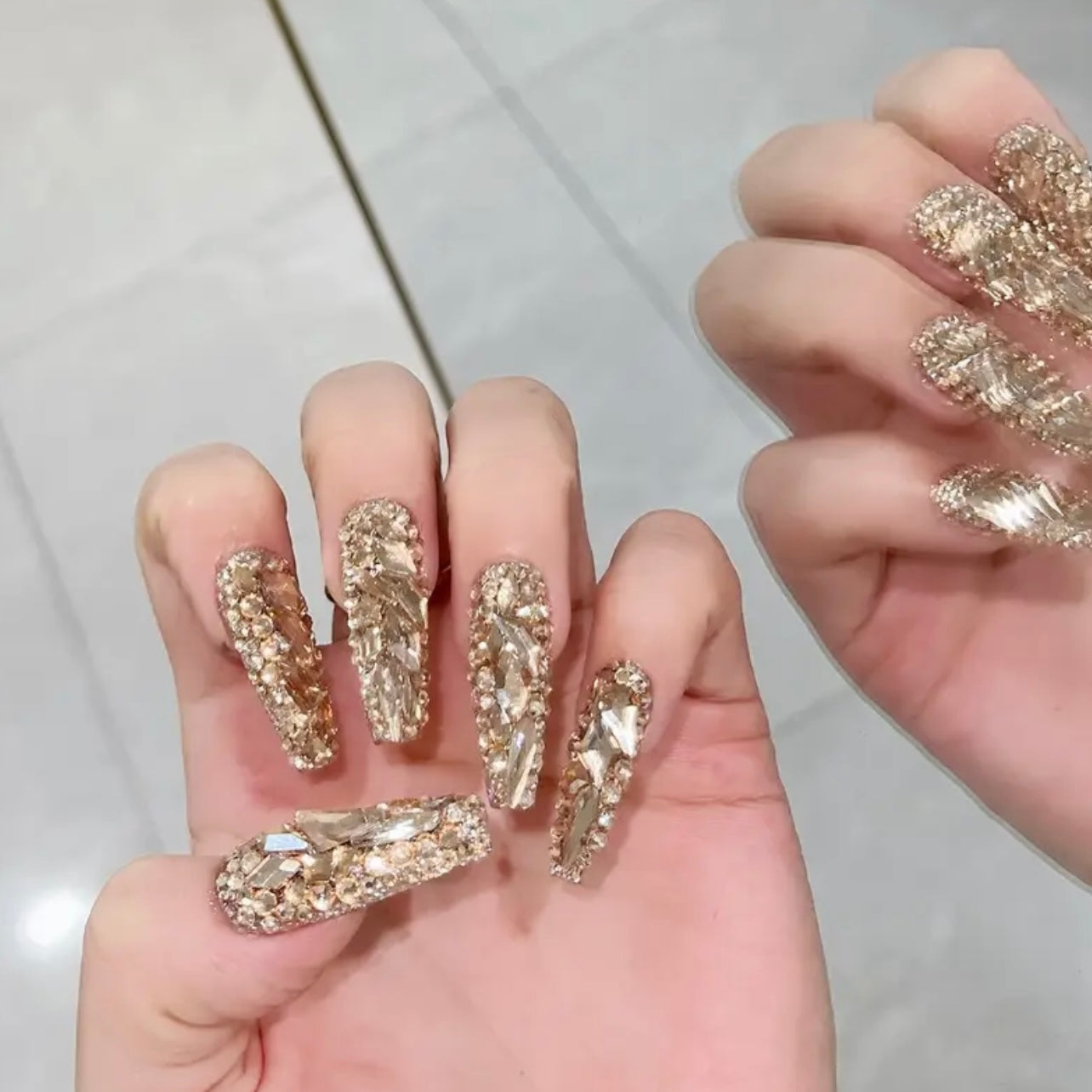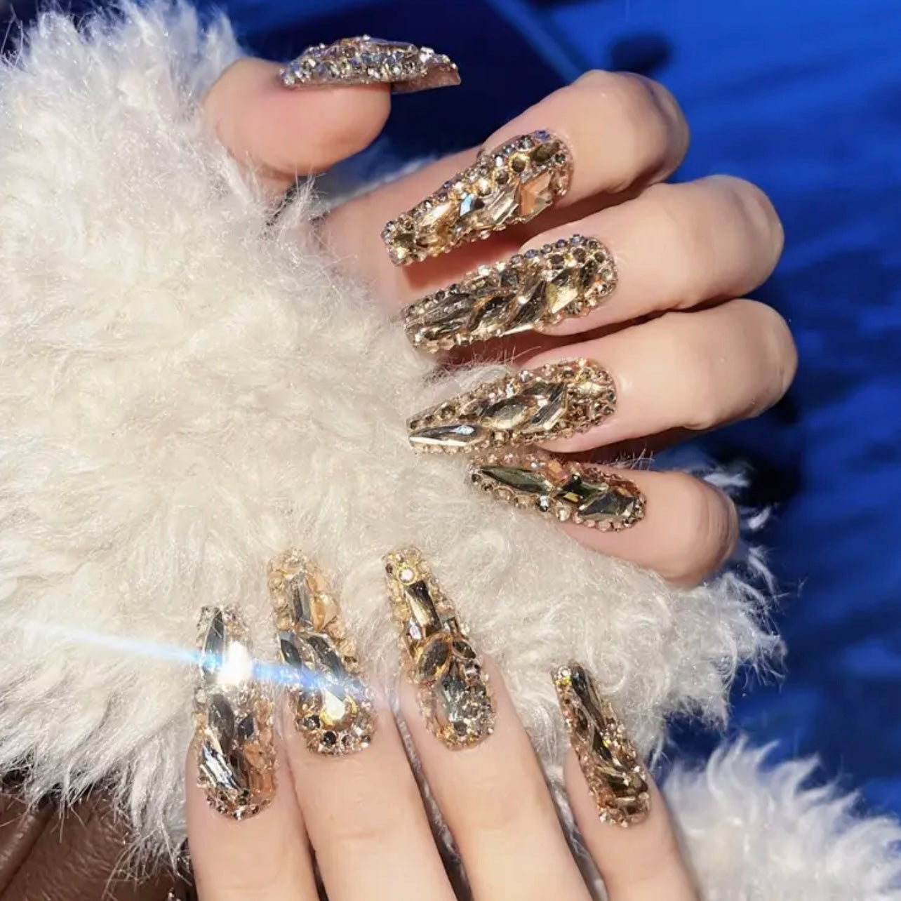 - 💅 Full Gold Rhinestone Coverage – Each nail is decked out in high-shine gold stones for a look that screams “main character.”