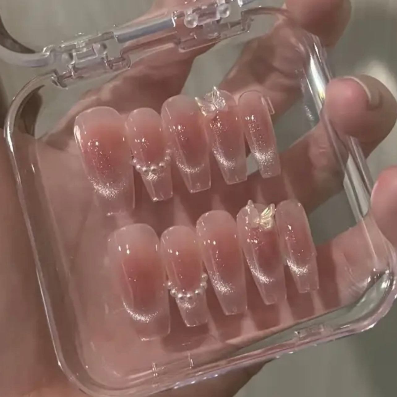 Float into a fairytale with AURORA MUSE — a 10-piece press-on set that whispers elegance. Coated in a pinkish nude with a silvery cat-eye glow, each nail is kissed with delicate pearls and crowned with a butterfly charm on each ring finger. It’s soft, feminine magic made for the muse who moves in grace and light.