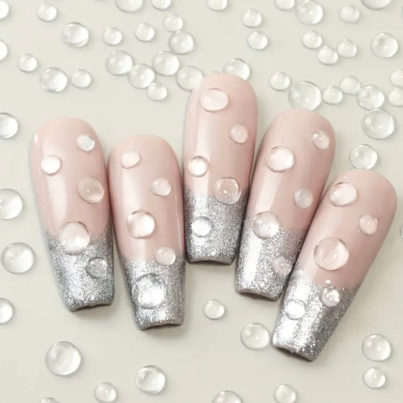 Nail charms that look like water drops are small, translucent embellishments designed to mimic the appearance of real droplets. Often made from clear resin or gel, these charms add a dewy, fresh effect to nail art, giving a 3D, glossy look that resembles moisture or rain. They’re perfect for creating natural, aquatic, or minimalist designs with a touch of elegance and realism.
